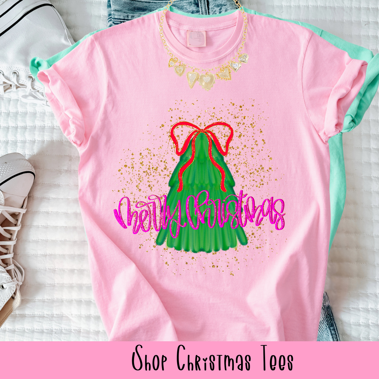 Handmade holiday shirts with festive sayings, coquette bows, and merry vintage vibes.