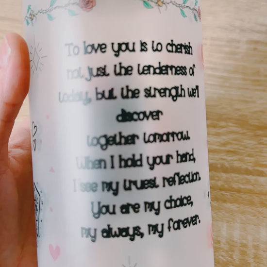 This tarot-inspired Lovers glass can is personalized with your names, making it a beautiful keepsake for couples, anniversaries, weddings, engagements, or Valentine’s Day. The frosted glass finish gives it a soft, elegant look while the bold black artwork adds contrast and drama.